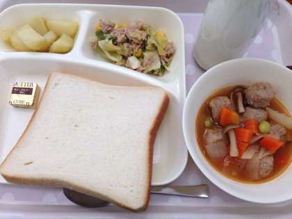 「ミートボールのケチャップ煮、ツナと野菜のソテー、焼きじゃが、食パン、バター、牛乳」です。