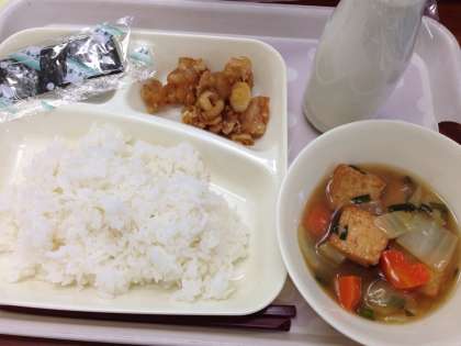 「あげどりのねぎだれかけ、あつあげとはくさいの中華煮、焼きのり、ごはん、牛乳」です。