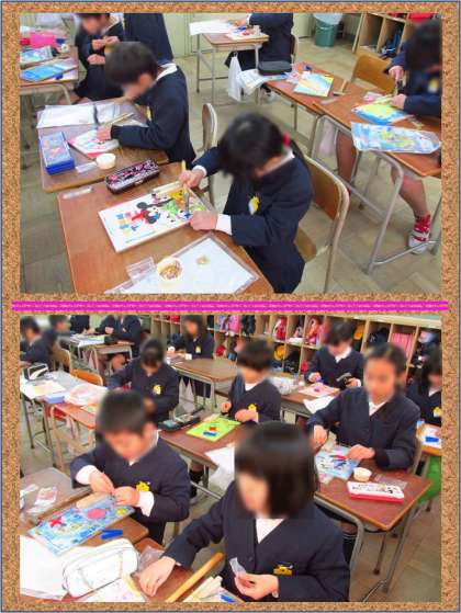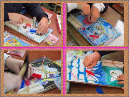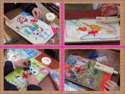 ピンボールを作っているようでした。下敷きほどの大きさの板にはいろいろなイラストが描かれています。玉の通り道や溜まるところを考えてイラストを配置してあるものもありました。