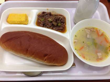 「牛肉のデミグラスソース煮、コーンスープ、かぼちゃのプリン、黒糖パン、牛乳」です。