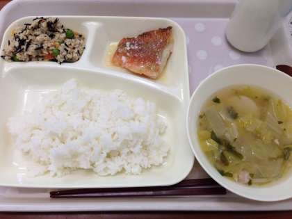 「赤魚のレモンじょうゆかけ、うすくず汁、高野どうふのいり煮、ごはん、牛乳」です。