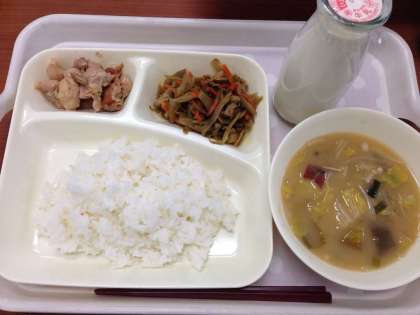 「鶏肉のてり焼き、さつまいものみそ汁、きんぴらごぼう、ごはん、牛乳」です。