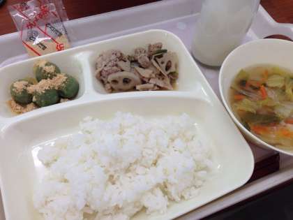 「豚肉とれんこんのいため煮、すまし汁、きな粉よもぎだんご、ごはん、牛乳」です。