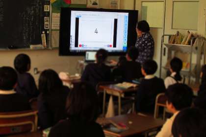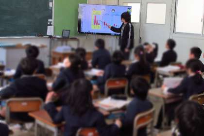 隣りのクラスでは、デジタル教科書を使って、10を作る補数の問題や、九九など既習事項について復習していました。