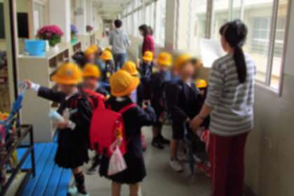 この日は、雨が降っていたので傘をさして歩きます。いつもはお友達と手をつないで2列になって歩きますが、今日は1列で歩きます。