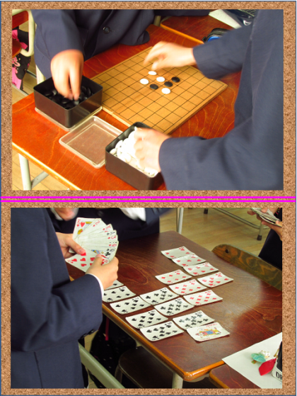 将棋をしている児童、碁石を使って五目並べをしている児童、トランプをしている児童、地球儀を見て世界の国を探している児童、学級文庫を読んでいる児童、おしゃべりをしている児童…。