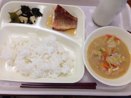 「赤魚のしょうゆだれかけ、みそ汁、わかたけ煮、ごはん、牛乳」です。