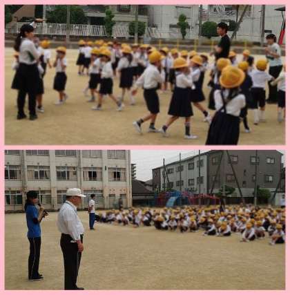 緊急放送の後、子どもたちが運動場に集まるまでにかかった時間は4分18秒。校長先生からは、今年度初めてとしては、早く集まることができたとほめていただくとともに、「おはし」は無しの話を聞きました。