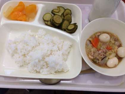 「八宝菜、きゅうりの中華あえ、ミックスフルーツ(缶)、ごはん、牛乳」です。
