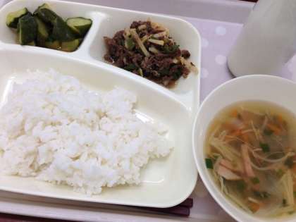 「チンジャオニューロウスー、ハムと野菜の中華スープ、きゅうりの辛みづけ、ごはん、牛乳」です。