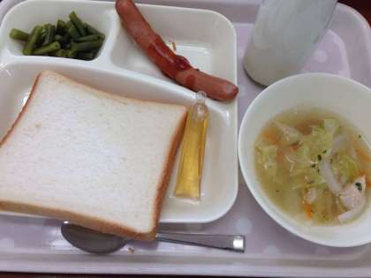 「ウインナーのケチャップソース、スープ、三度豆のサラダ、食パン、はちみつ、牛乳」です。