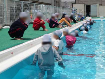 次に、身近にあるものにつかまって体を浮かせて救助を待つ練習をしました。2リットルのペットボトルにつかまって、どの子も上手に浮かんでいましたよ。
