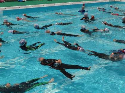 まずは、服を着て入水。歩いたり潜ったりして、水着だけの時との様子の違いを体験しました。プールサイドに上がるのもいつも以上に大変だということにも気づくことができました。