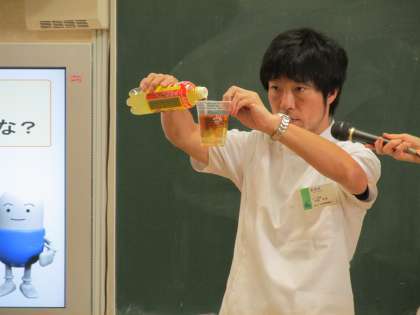 前半に、薬のはたらきや、薬の正しい飲み方について学習しました。ジュースで薬を飲むと、効き目が弱くなったり、効き目が変わる場合があったりすることを、実際に実験して見せていただきました。