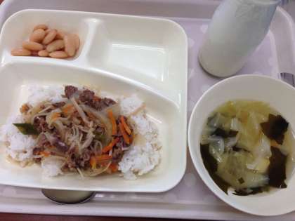 「牛丼、すまし汁、大福豆の煮もの、牛乳」です。