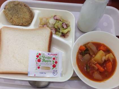 「チキンレバーカツ、ケチャップ煮、たことキャベツのソテー、食パン、りんごジャム、牛乳」です。