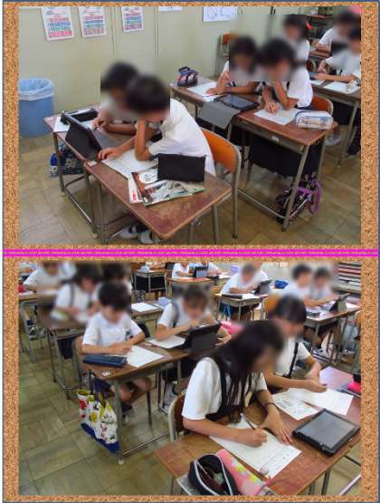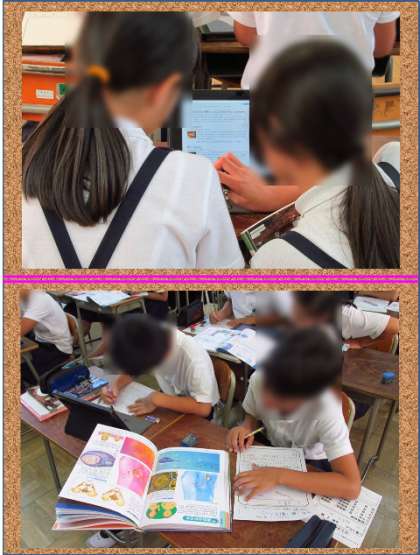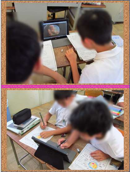 タブレットパソコンは回線安定のため、二人で1台使っていました。また、初めて使う児童も多く、二人だとお互いに協力して活動することもできます。