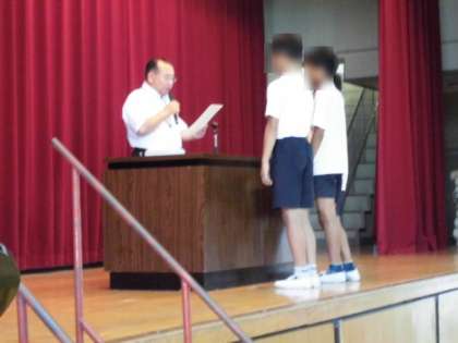 初めに、校長先生からNSC(長吉サッカークラブ)の皆さんへ表彰がありました。その後、1学期間を振り返り、どの子も一生懸命頑張ってきたことをほめていただきました。