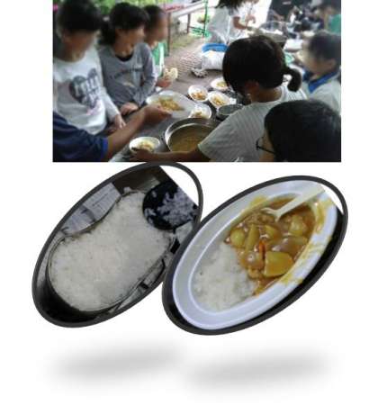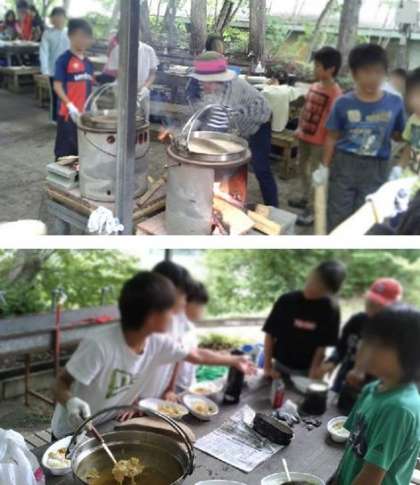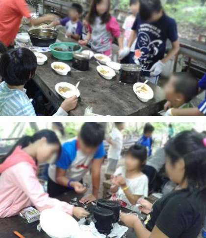 飯ごうをひっくり返して蒸らしている間に、新聞紙でススを落としておきます。鍋も煮えてきたら、ルーを入れます。グツグツ煮込んだらカレーの完成です。