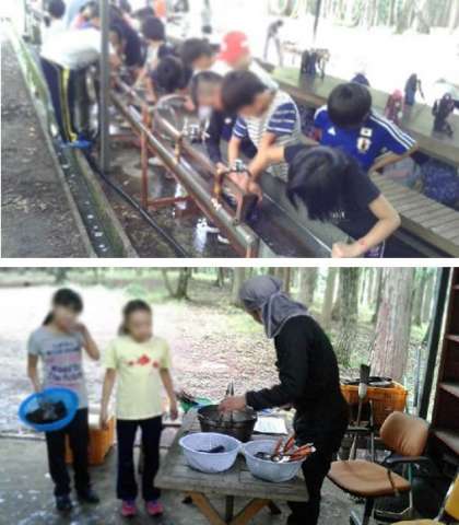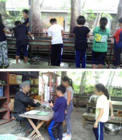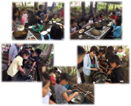 カレーを食べ終わったら片付けです。かまどの灰を処理する係、テーブルを片付ける係、鍋を洗う係…。中でも、飯ごうと鍋はきれいにするのが大変です。洗い終わったら宿舎の方の返却チェックがあるのですが、これが厳しい…。スボンジでもたわしでも金だわしでも何でこすっても落ちない!?