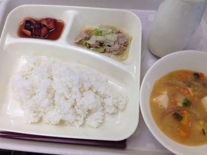 「たこのやわらか煮、みそ汁、野菜いため、ごはん、牛乳」です。