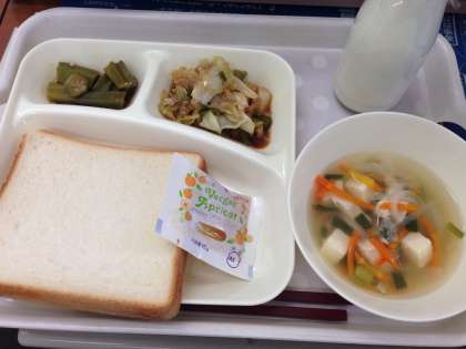 「ホイコウロー、とうふのスープ、オクラの中華あえ、食パン、アプリコットジャム、牛乳」です。