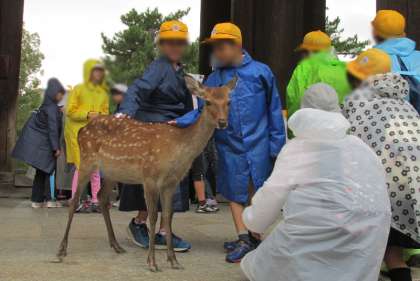 駅から東大寺に向かう道で、あちこちにいる鹿に初めて出会う児童もいて、喜ぶ児童や怖がる児童がいました。