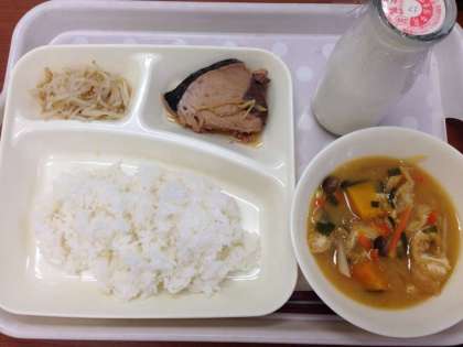 「なまりぶしのしょうが煮、みそ汁、もやしのごまあえ、ごはん、牛乳」です。