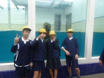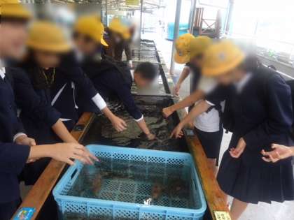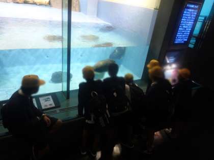 エイやタコなどを触れる体験コーナーでビクビクしながら触っています。