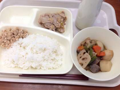 「豚肉のねぎだれかけ、ふきよせ煮、ツナ大豆そぼろ、ごはん、牛乳」です。
