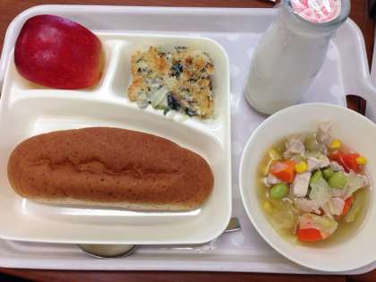 「スープ煮、ほうれん草のグラタン、りんご、ライ麦パン、牛乳」です。