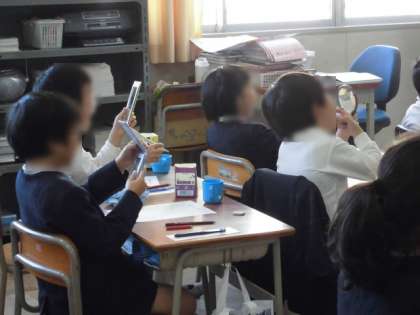 前半に、前歯を1本だけ赤く染め、むし歯の原因となる「歯こう」がついていないかを調べました。