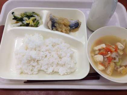 「さごしのおろしじょうゆかけ、けんちん汁、こまつなとはくさいの甘酢あえ、ごはん、牛乳」です。