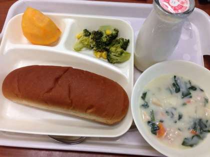 「ほたて貝のクリームシチュー、ブロッコリーとコーンのサラダ、富有柿、黒糖パン、牛乳」です。