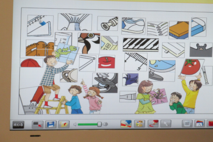 教科書のイラストの中から「What's this?」と指を指されたものを英語で答えなくてはいけません。知らない単語もありますが、チームで相談してもいいので助け合います。