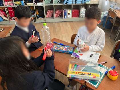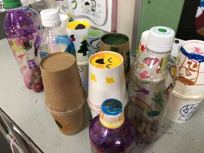 生活科の時間に、秋の遠足で拾ってきたどんぐりを使って、「どんぐりマラカス」をつくりました。ペットボトルや紙コップ、ヤクルトなどにどんぐりを入れ、周りを丁寧に飾り付けました。