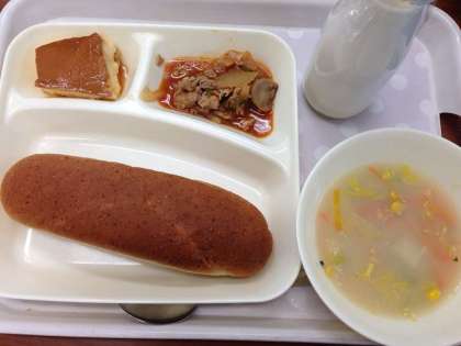 「豚肉のケチャップソテー、コーンスープ、焼きプリン、ライ麦パン、牛乳」です。