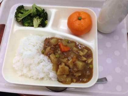 「冬野菜のカレーライス、ブロッコリーのサラダ、みかん、牛乳」です。