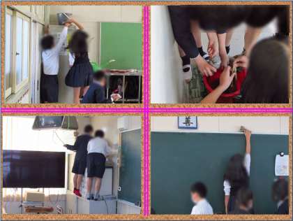 教室の上の方の窓やテレビの周り、黒板の上の部分もきれいに雑きんで拭いています。