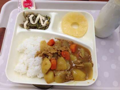 「ポークカレーライス、ごぼうサラダ、パインアップル(缶)、牛乳」です。
