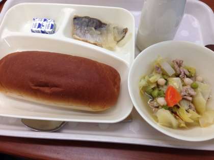 「あじのレモンマリネ、スープ煮、固形チーズ、黒糖パン、牛乳」です。