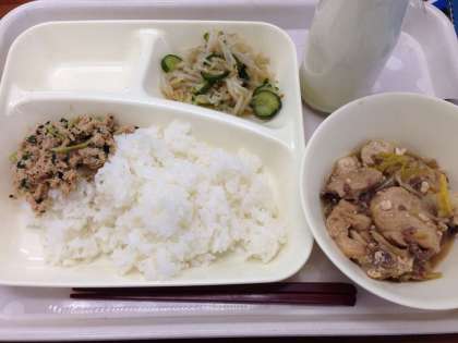「すき焼き煮、もやしときゅうりのしょうがづけ、ツナっ葉いため、ごはん、牛乳」です。