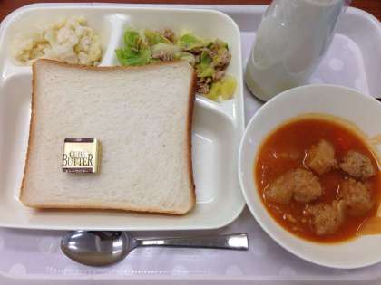 「ミートボールと野菜のケチャップ煮、ツナと野菜のソテー、カリフラワーのレモン風味サラダ、食パン、バター、牛乳」です。
