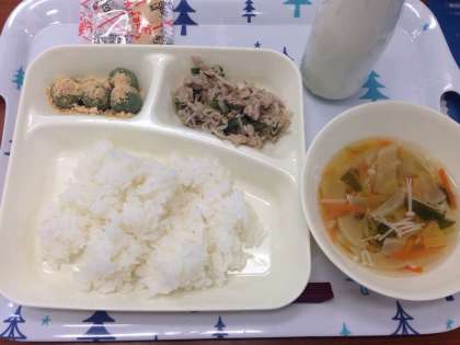 「豚肉と野菜のいためもの、すまし汁、きな粉よもぎだんご、ごはん、牛乳」です。