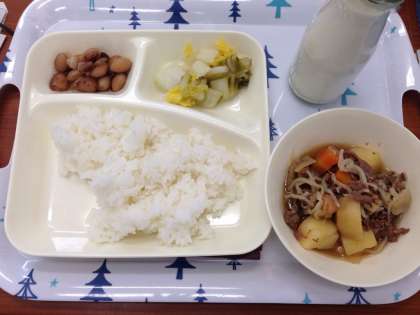 「肉じゃが、はくさいの甘酢づけ、とら豆の煮もの、ごはん、牛乳」です。