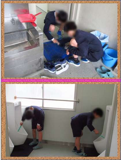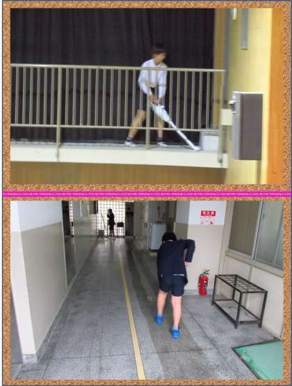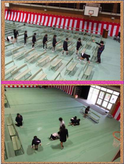 練習中から講堂にはシートがしかれてあったのですが、上靴で練習していました。けれども、よりきれいな会場になるように雑巾できれいに拭いていました。