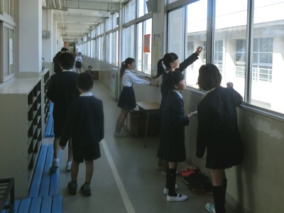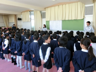 4月5日(木)午前、入学式を明日に控えた今日、新6年生と新2年生が登校してきました。新6年生【写真左・右】は入学式準備のため、1年生の教室や廊下・階段の掃除や掲示のお手伝いをしました。新2年生【写真中】の104名は、第2音楽室で、新1年生の前で披露する「歓迎のことばと演技」の最終練習を行いました。