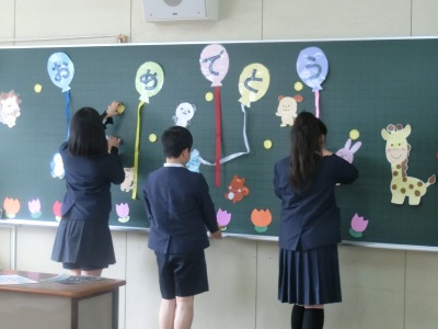 1年生の教室の準備も整い、いよいよ明日は、新1年生をお迎えします。明日の入学式は、10時開式で、保護者の方々のご来校受付は、9時10分からとなっています。