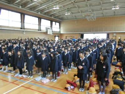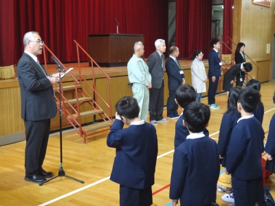 4月9日(月)、約2週間の春季休業が終わって、子どもたちは久しぶりに登校してきました。9時に2年生から6年生の445名は講堂に集まり、平成29年度末人事異動により新しく赴任された教職員8人の「着任式」【写真左】を行いました。