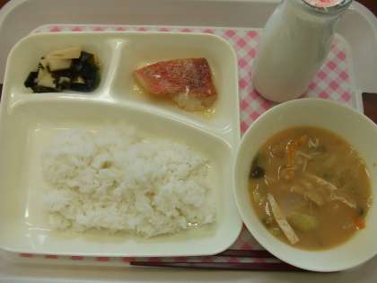 「赤魚のゆずの香焼き、みそ汁、わかたけ煮、ごはん、牛乳」です。